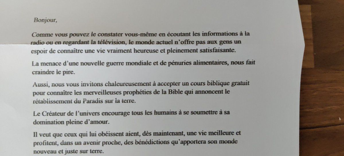 A Namur on est plus classique, ce sont les témoins de géauva qui prosélytisent. Ils se modernisent cela dit, y a un QR code sur leur papier (avec le dinosaure de Google Chrome for some reason?)